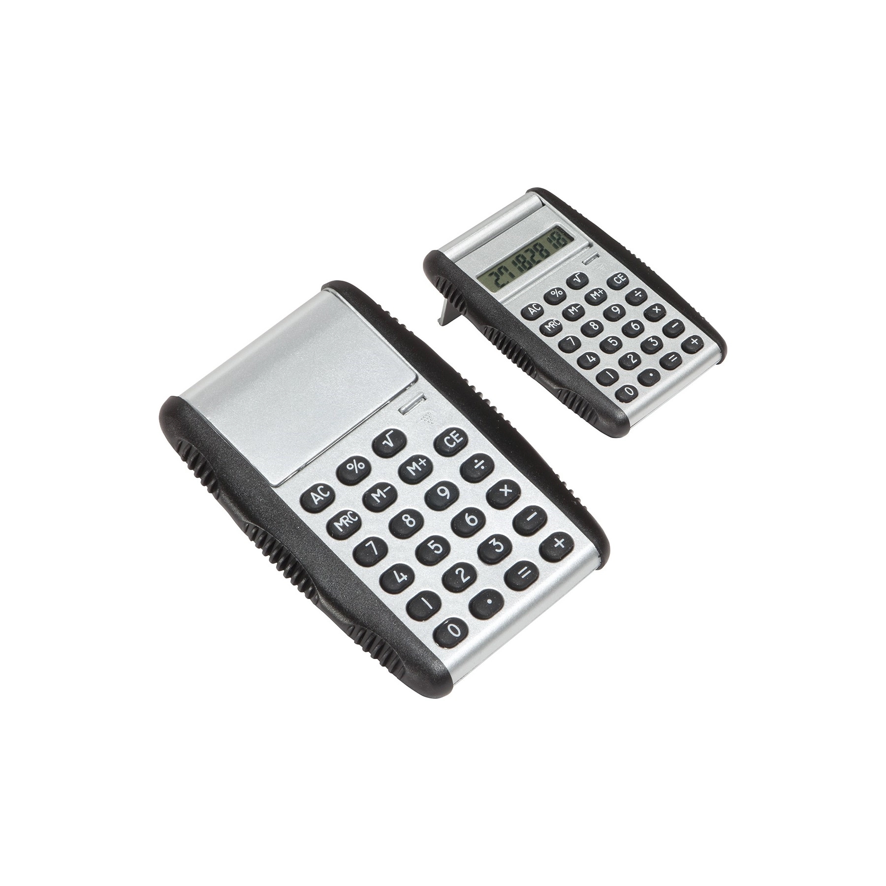 Display cover flips open to form a stand, 8-digit display with memory functions, Textured side grips.