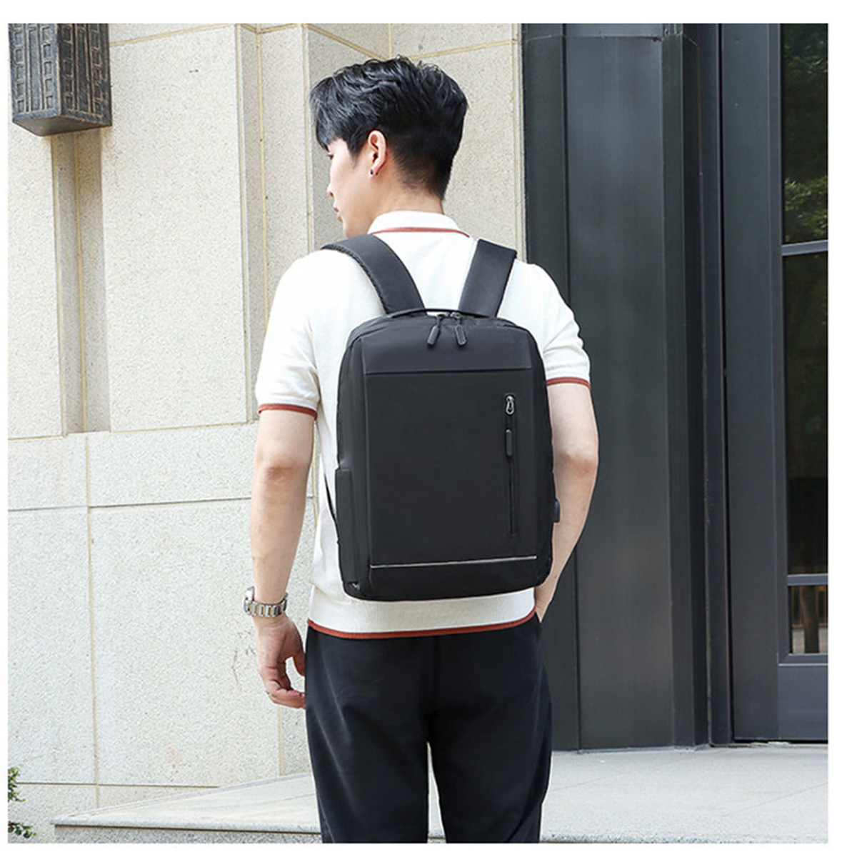 It is a business backpack made of PC hard shell with its own USB/C charging for holding a laptop.