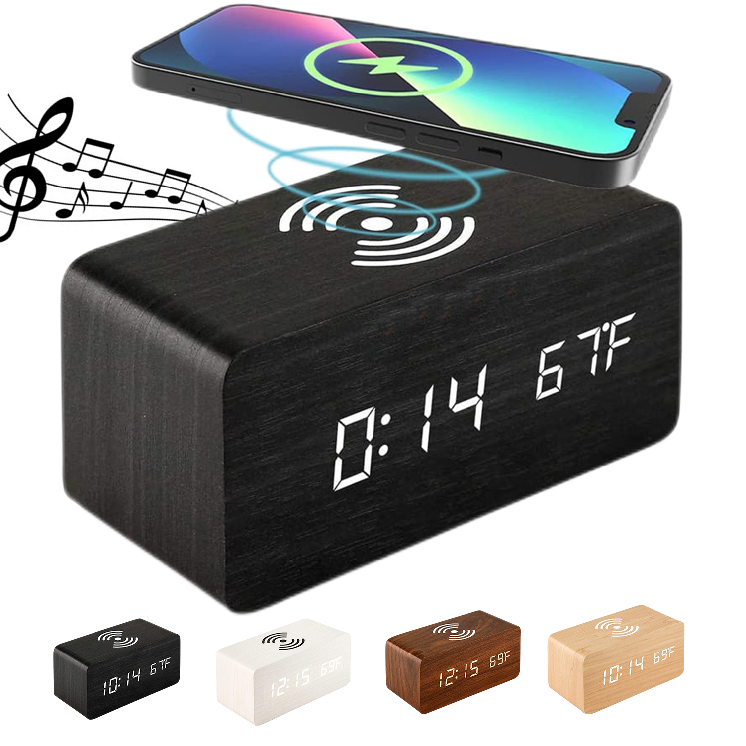 Wooden Wireless Charging Alarm Clock With Bluetooth Speaker