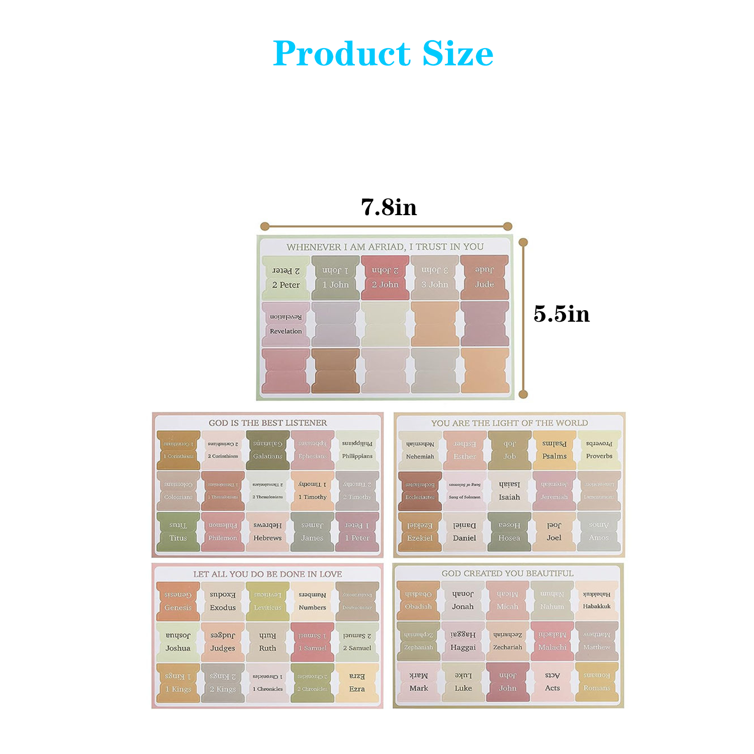 Includes 39 Old Testament books, 27 New Testament books, and 9 blank tabs, all spread across five sheets.