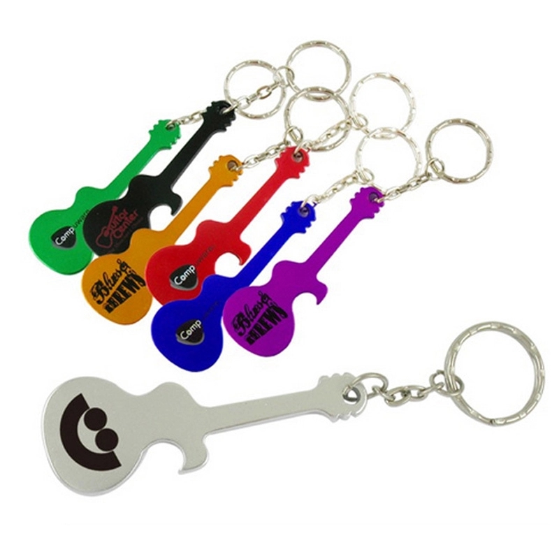 Electric guitar-shaped bottle opener and keychain with split ring hardware.