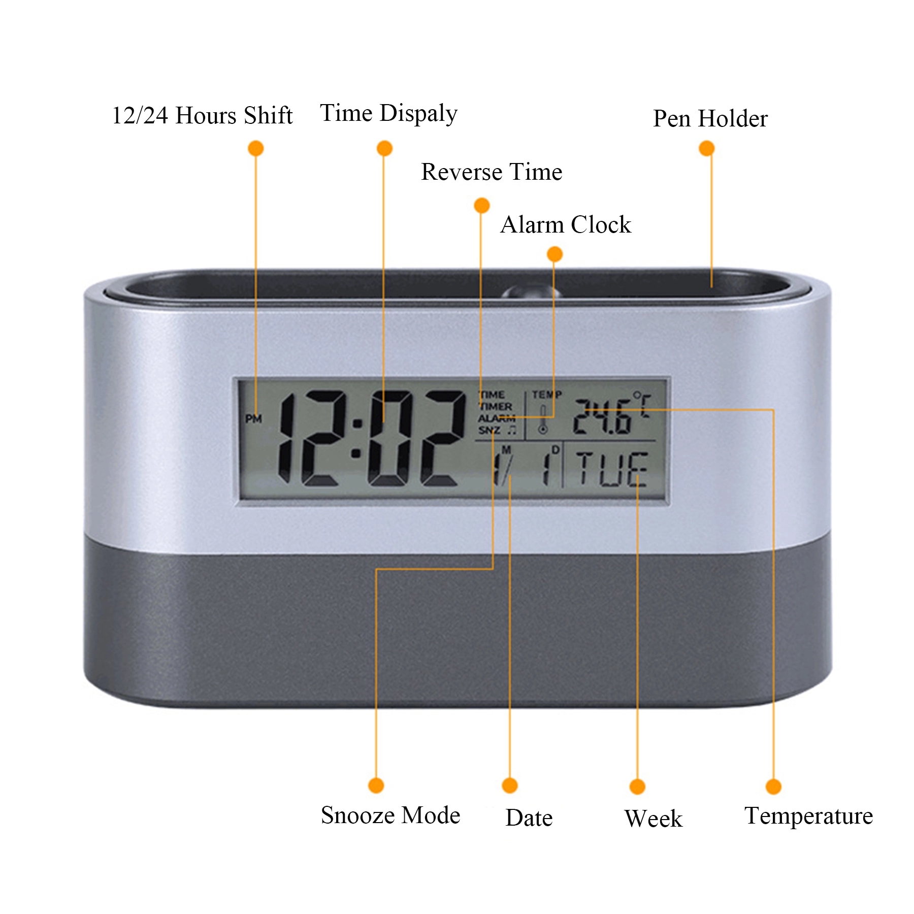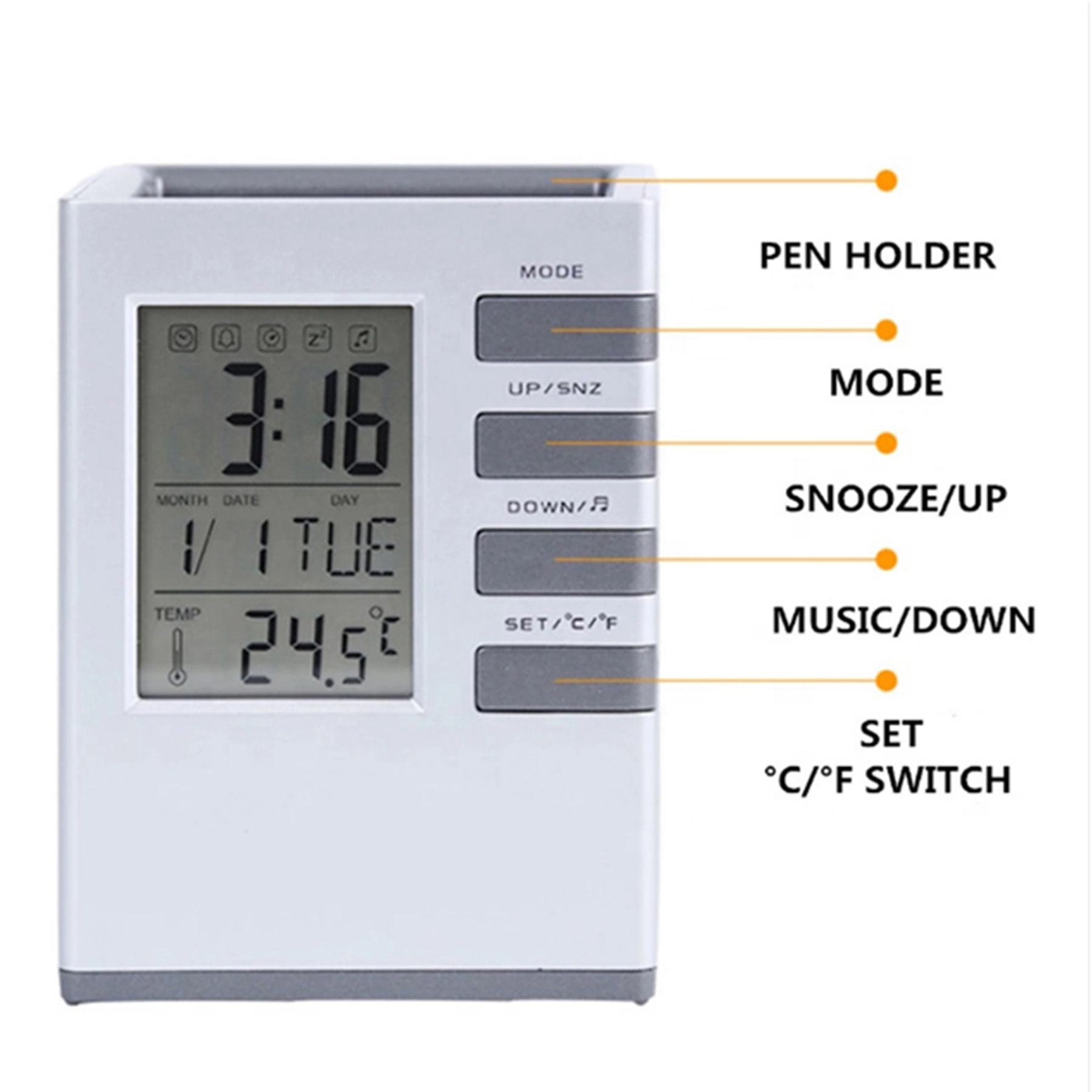 Multifunctional pen organizer display time, date, week, temperature and 12/24 hours shift.