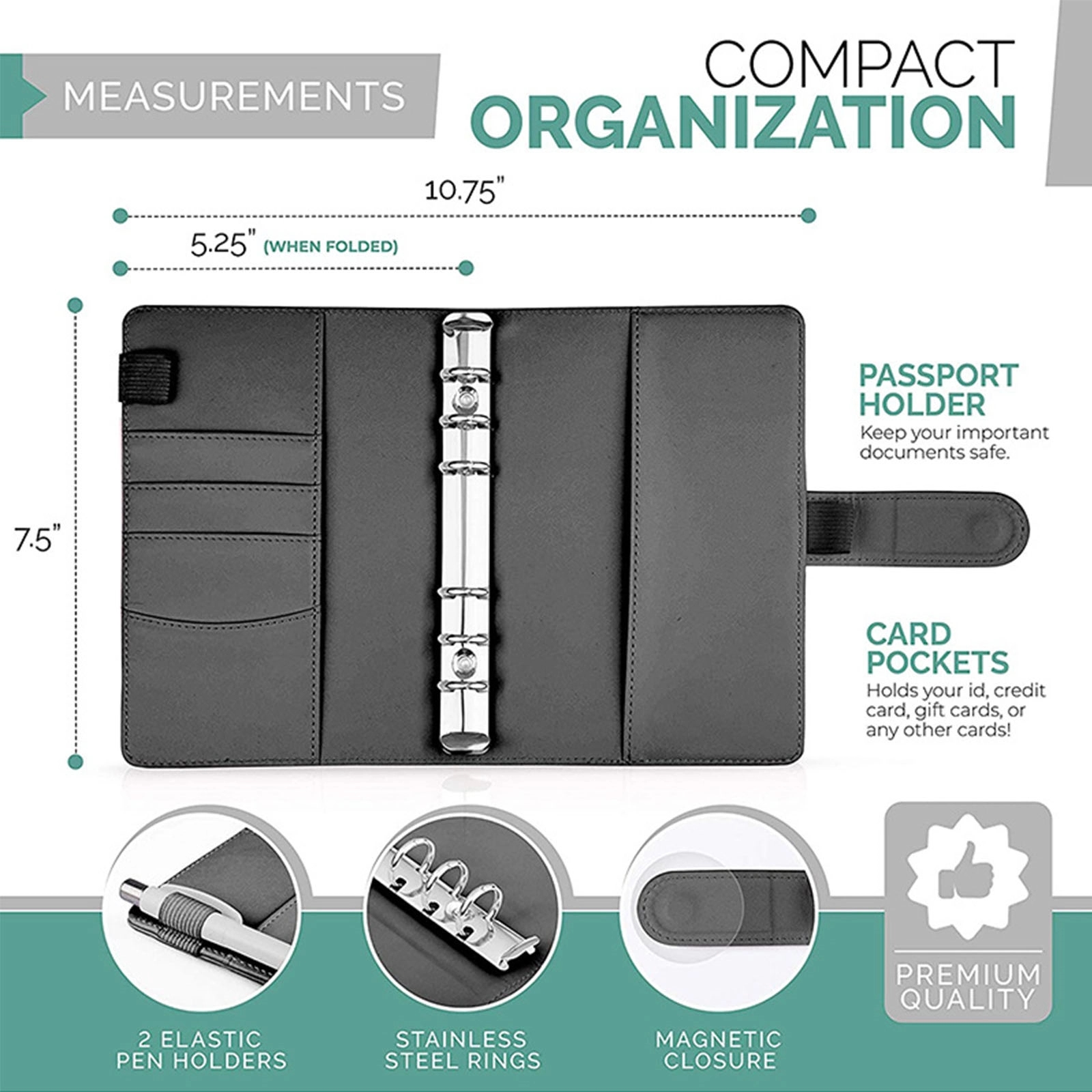 PU binder is made from PU leather, Card sleeves and pen loops inside, easily store pen, ID card, bankcard & passport.