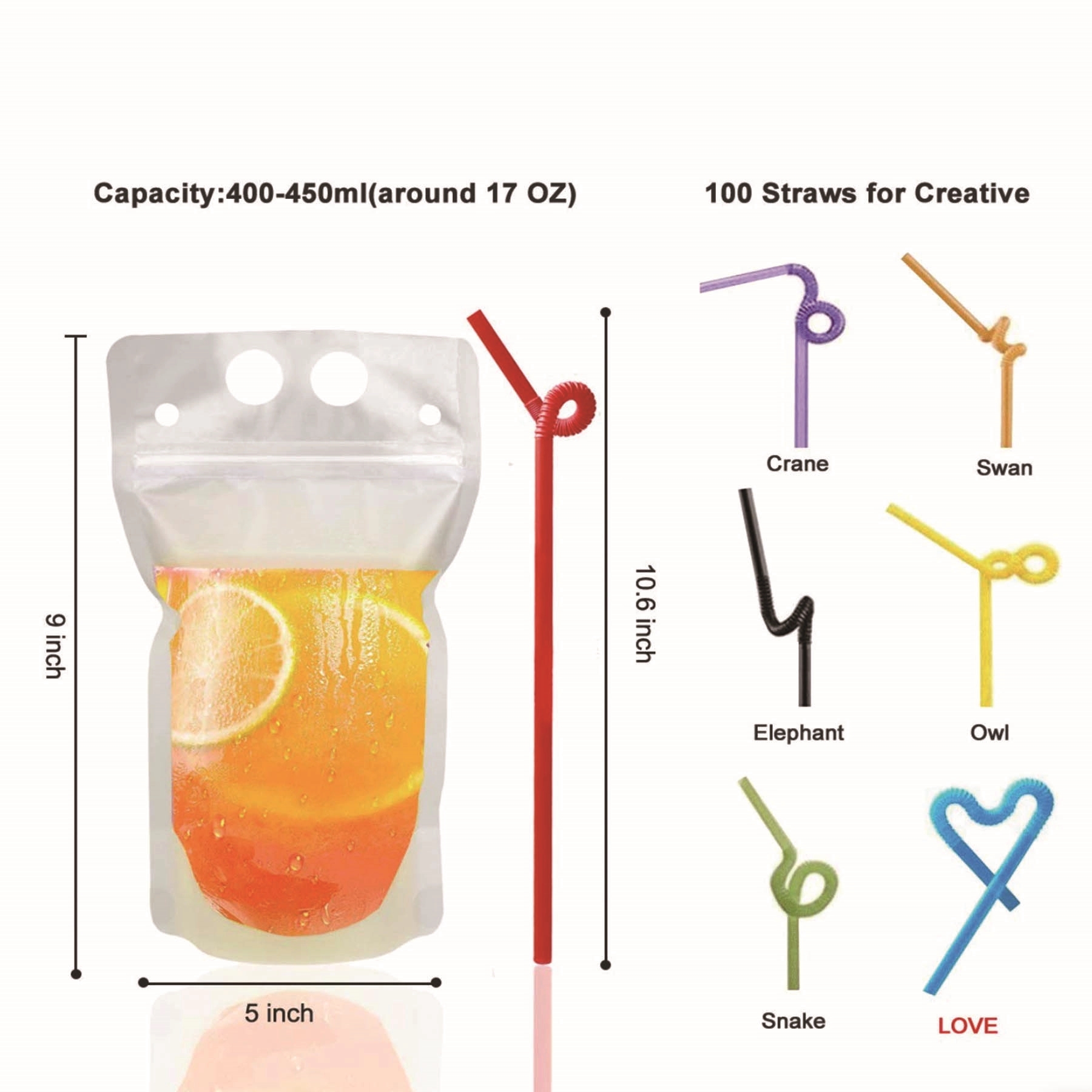 Hand-held Stand up Re-closable Zipper Drinking Pouches Bags With Straw is made of eco friendly PET PE MOPP.