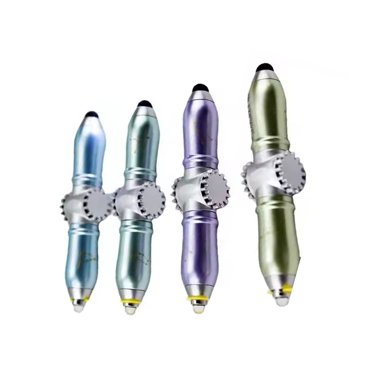 Compact 3-in-1 fidget spinner LED touch pen, 3.5 inches, combines writing, touch, and stress-relief functions.