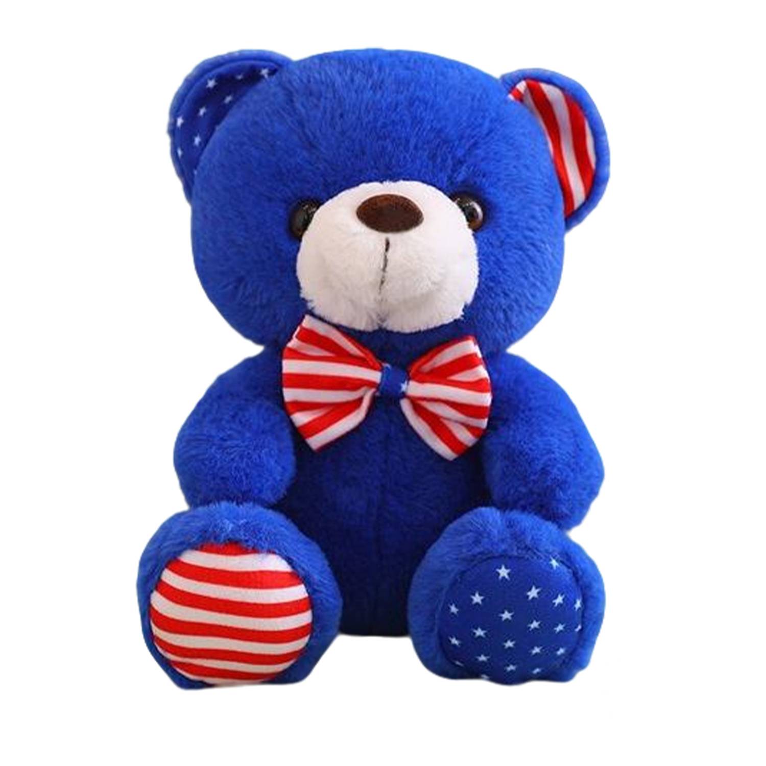 This plush patriotic bear delights with soft rabbit fur, safe PP cotton, cozy cuddles, and festive décor use.